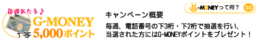 - 1等:G-MONEY 5,000ポイント/1等前後賞:G-MONEY 3,000ポイント